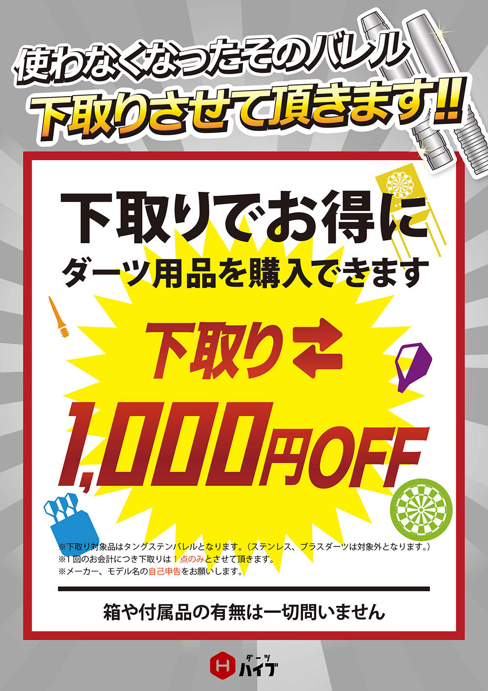 箱や付属品の有無にかかわらず、お会計時にスタッフへ下取り希望のタングステンダーツをお渡しください。下取り対象商品であった場合、お会計金額から1,000円をお値引きいたします。