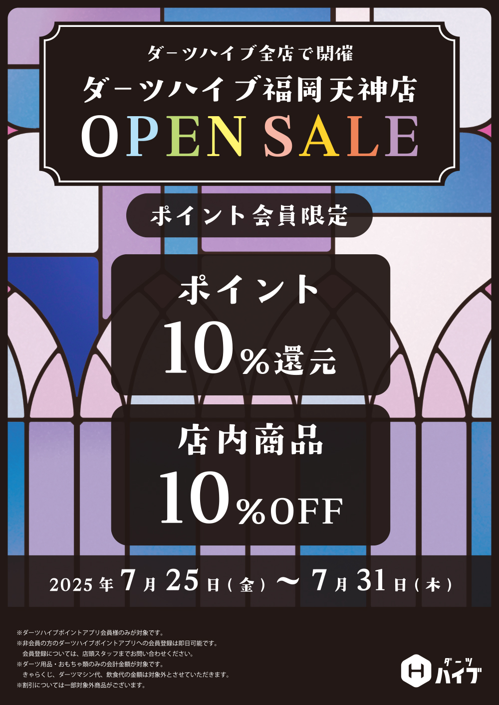 ダーツハイブ福岡天神店の新オープンを記念いたしまして、2025年7月25日(金)開店~7月31日(木)閉店までの期間中、ダーツハイブ福岡天神店は店内商品全品10%OFF&ポイント10%還元のオープンセールを実施いたします。