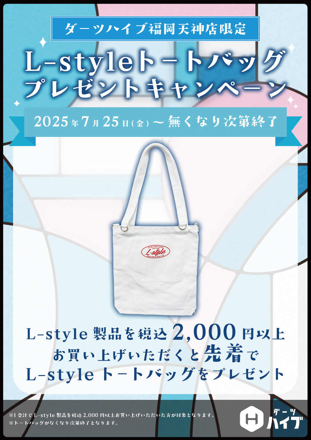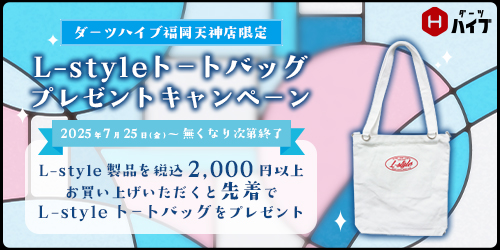 ダーツハイブ福岡天神店にて、L-style製品を税込2,000円以上お買い上げいただいたお客様に、先着でL-styleトートバッグをプレゼント!