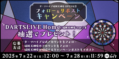 本キャンペーン期間中に「ダーツハイブオンライン(@DARTSHIVE)」と「ダーツハイブ福岡天神店(@dh_tenjin)」をフォローし、ダーツハイブ福岡天神店が投稿するキャンペーンポストをリポストしていただくだけで、抽選で1名様に【オリジナルデザインDARTSLIVE Home(ダーツライブ ホーム)】をプレゼント!