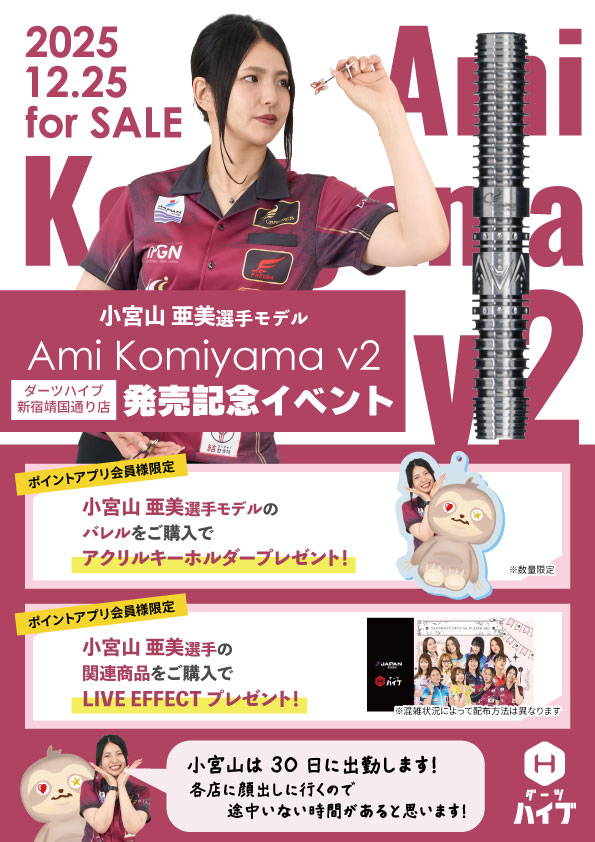 「Ami Komiyama v2」発売を記念して、12月25日(木)以降にダーツハイブ新宿靖国通り店でご購入いただいた商品に応じて、限定アクリルキーホルダーやライブエフェクトをプレゼント!