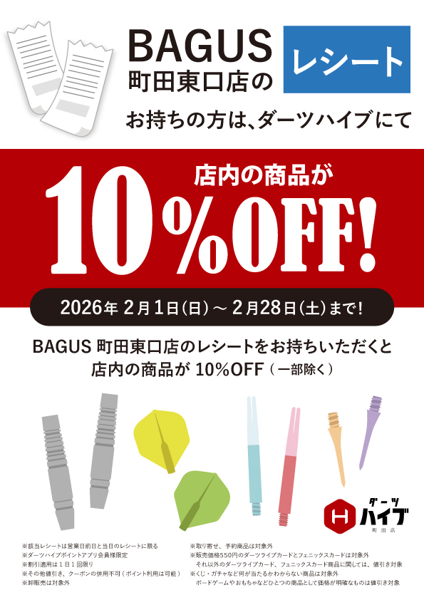 期間中、BAGUS町田東口店のレシートをお持ちいただくと、ダーツハイブ町田店でのお買い物が10%OFFになります!