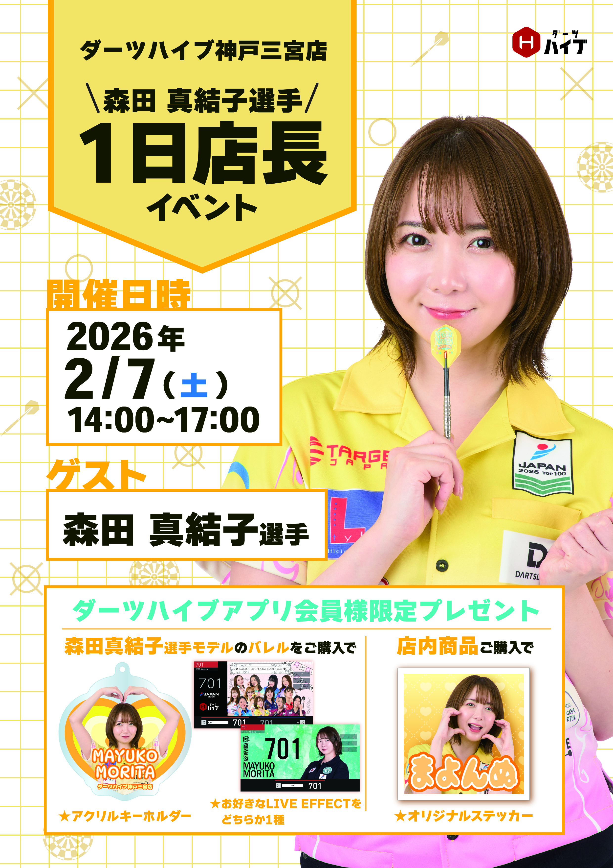ダーツハイブ神戸三宮店では森田 真結子選手をご招待し、プレイヤーイベントを開催いたします。